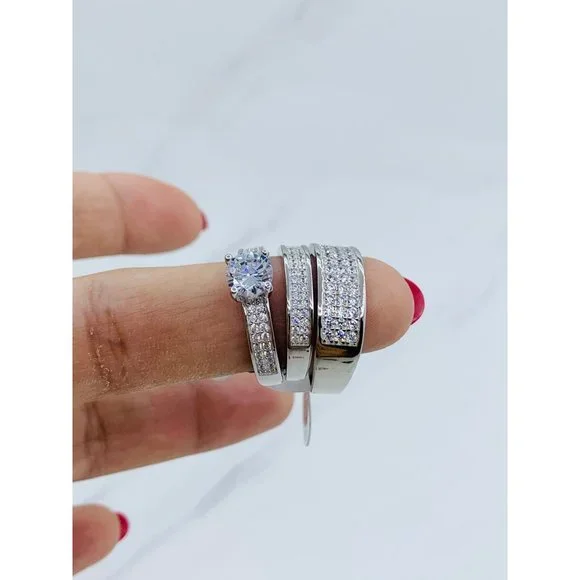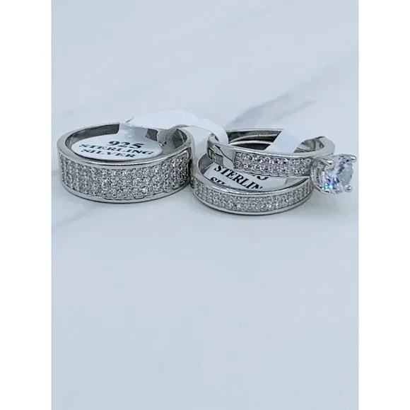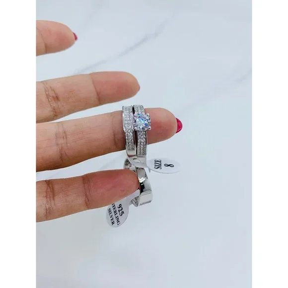 ❤️ 925 Sterling silver ring men and women wedding set ❤️ White cubic zirconia stones ❤️ Ring size 11 men band ❤️ Ring size 8 women band and engagement New ❤️ Anillos de boda Plata real 925❤️ Tamaño 11 de hombre ❤️ Tamaño 8 de mujer (argolla y compromiso) ❤️ Anillos de matrimonio❤️ Piedra color zircon blancaSKU 077563