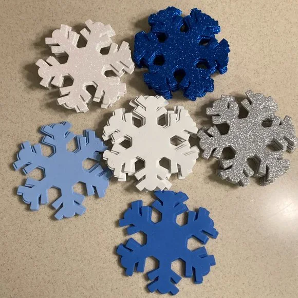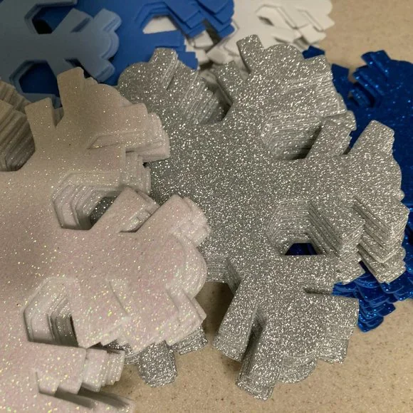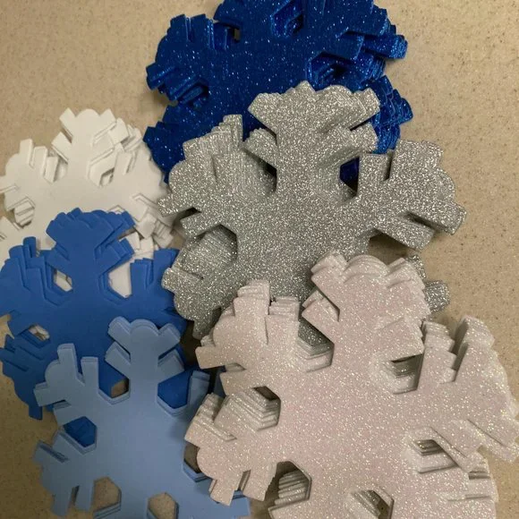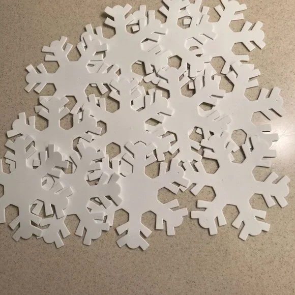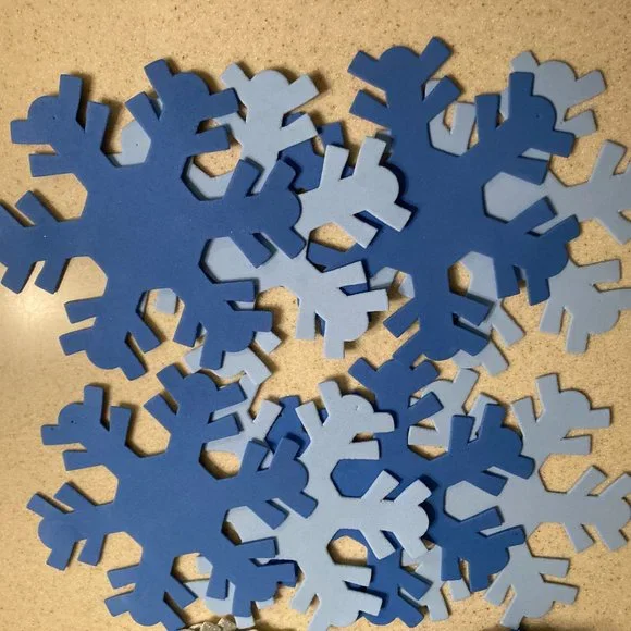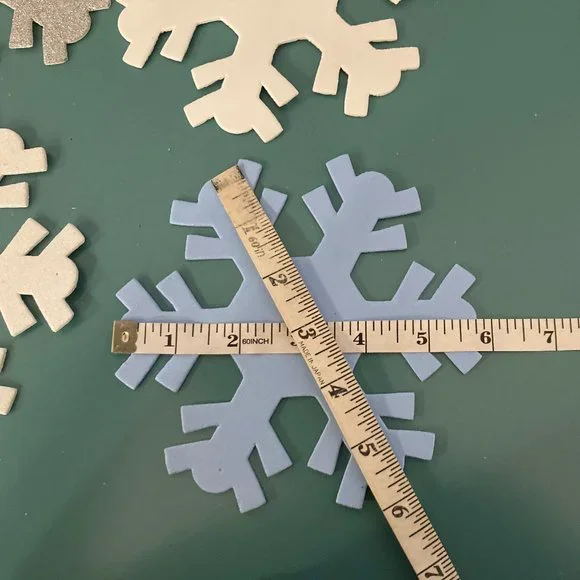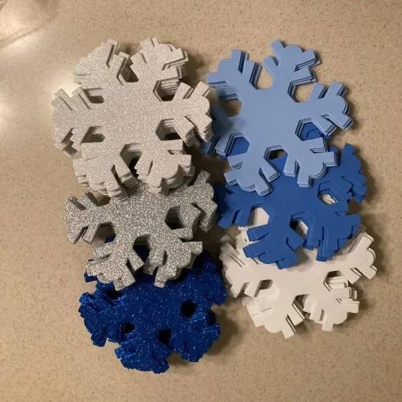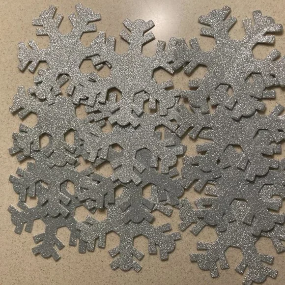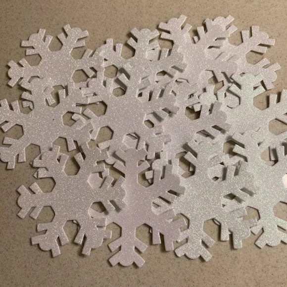 LARGE Foam SnowflakesChristmas Cottage Snowflake OrnamentsWhite, Silver, and Blue Sparkling Glitter White, Blue, and Baby Blue PlainThe amounts are:White Sparkly 12, Silver Sparkly 12,Blue Sparkly 16White 12, Blue 4, Soft Baby Blue 4Add some sparkle to your holiday decor with these beautiful foam snowflake ornaments! The set includes 60 (sixty) snowflakes that are perfect for adding to your tree, wreath, or garland. Each snowflake is made from high-quality foam and features intricate details that makeit a stunning addition to any collectionUse over doorways, on walls, cabinets, lovely on windows too!I used them once on a huge tree, just placed them on the branches, it lookedbeautiful but sold the tree when I downsized.Like New to New ConditionOriginally sold in packages of 4 for $8.00. This listing is for 60 snowflakes.!