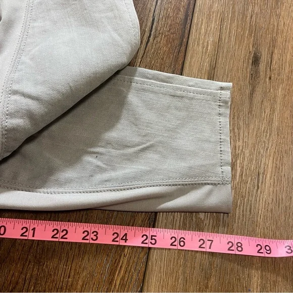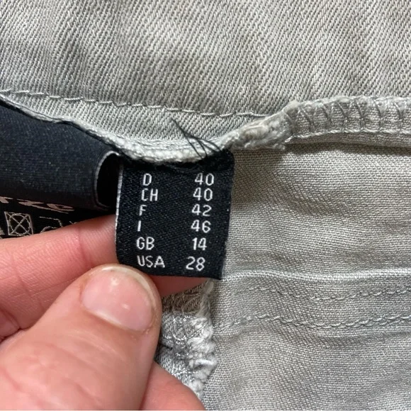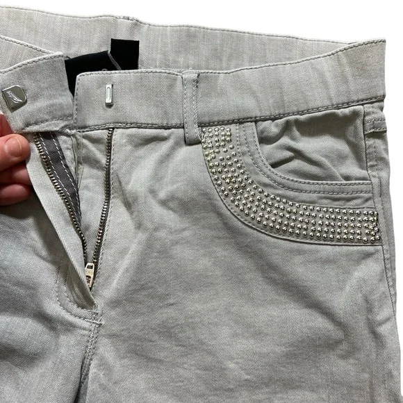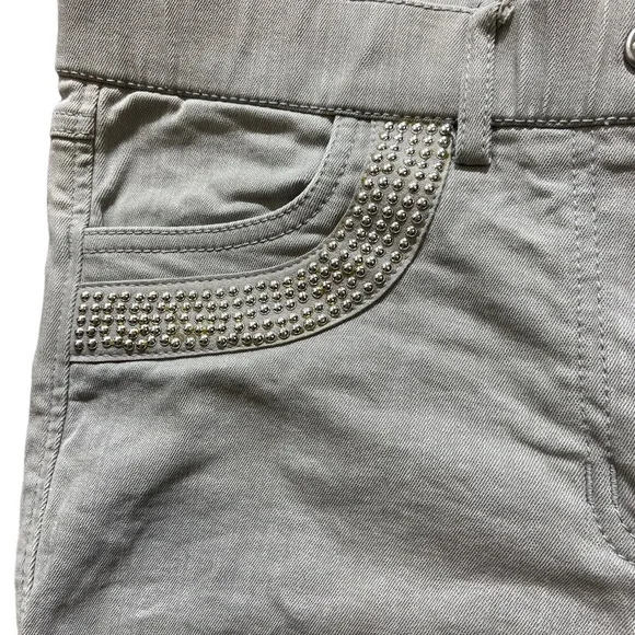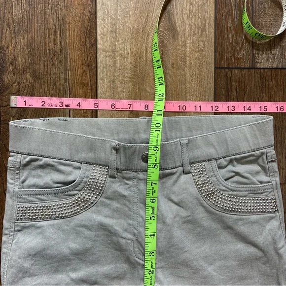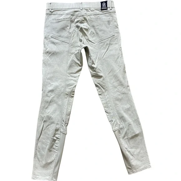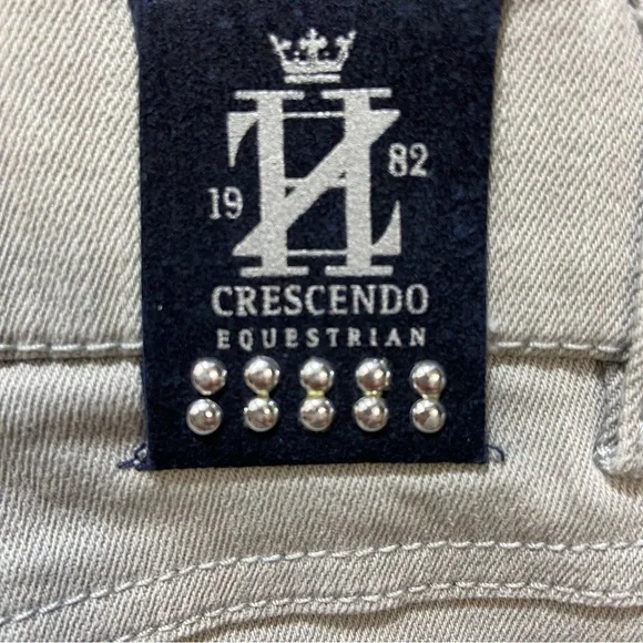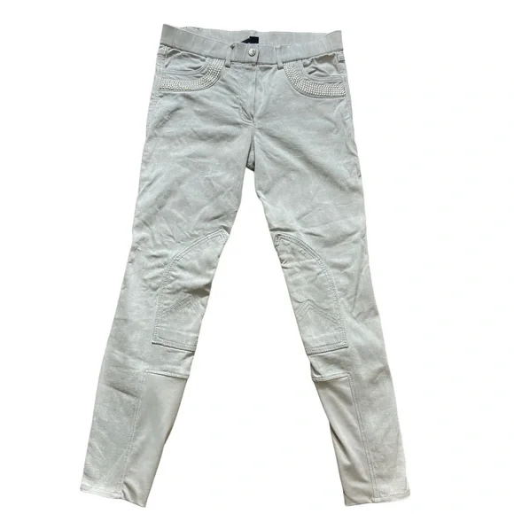 Horze Crescendo “Petrina” Equestrian Stretch Denim Breeches Size 28. Please refer to photographs for approximate measurements.Color: light gray with silver tone beading on pockets.Tab and zipper closure.Front and rear pockets.Belt loops.Knee patches.Tags: equestrian, riding, lessons, casual, English, dressage.The photographs show exact item you will receive; no stock images. Good pre-owned condition. There is a light mark on rear of left leg, as photographed. No rips or tears. All pocket beading is in place, as photographed.Smoke free home.